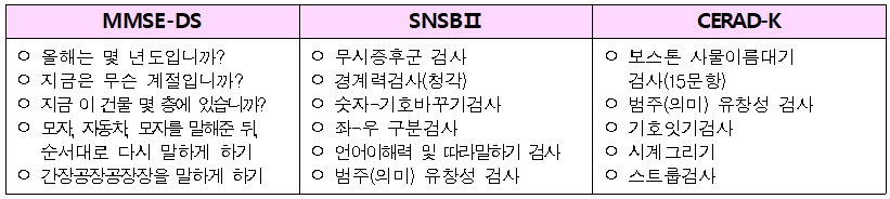 1단계 선별검사, 2단계 진단검사, 3단계 감별검사로 총 3단계 검사를 통해서 치매 진단을 합니다.