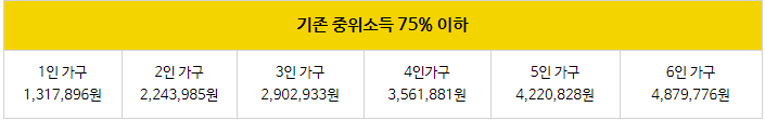 지원대상 기준에 소득기준, 재산기준, 금융재산기준이 있는데 이 중에서 소득기준의 중위소득 75% 이하는 아래와 표와 같습니다.