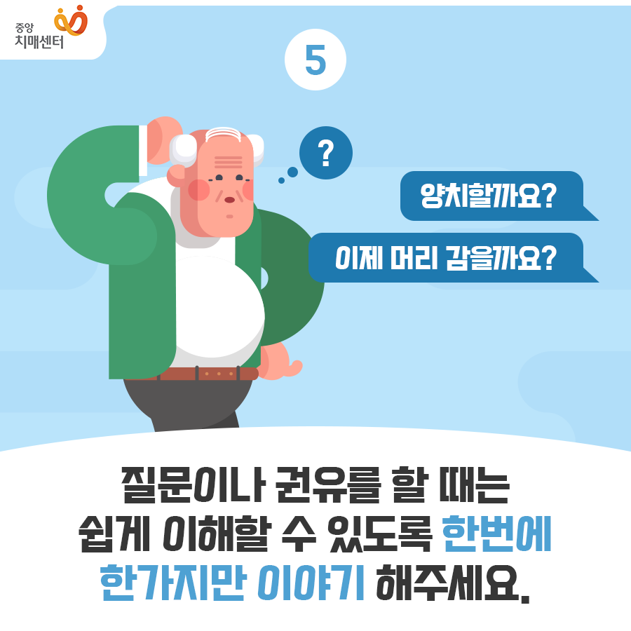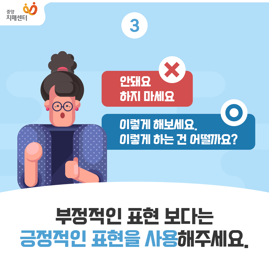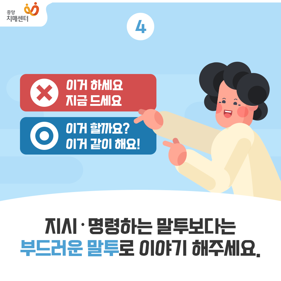 누구에게나 해당되지만 지시하는 말투나 명령하는 말투는 좋지 않습니다. 치매 환자의 경우도 마찬가지로 인지 능력이 조금 떨어진다고 어린아이 대하듯이 명령투를 사용하는 것은 바람직하지 않다고 생각합니다. 치매 환자가 24시간 내내 치매 상태로 판단 능력이 안좋은 상태로 있는 것이 아니고, 안좋은 상태에 있는 것은 짧은 시간이기 때문에 아무일없는듯 평상시처럼 대하고 부드럽게 이야기하는 것이 좋습니다.