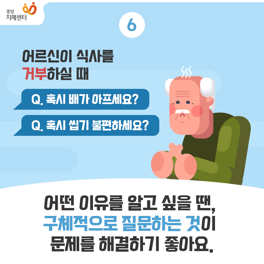 치매가 많이 진행된 환자의 경우는 문제가 있어도 어떤 문제가 있는지 잘 모르는 경우가 있습니다. 스스로도 인지를 잘 못하고 이야기를 하지 않는다면 보호자도 문제가 있는지 모릅니다. 평소 보호자가 생활 습관을 잘 파악하고 있고 불편해 보인다면 어떤 점이 불편한지 구체적으로 물어보는 것이 좋습니다. 답변을 잘 해준다면 좋지만 그렇지 않고 문제가 심각하다면 치매 상담 센터에 문의를 해보시는 것도 좋을 것 같습니다.