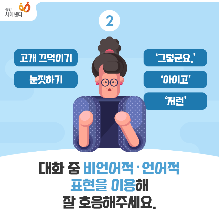 치매환자와 대화할때 대화하는 사람이 충분히 당신의 이야기를 잘 듣고 있다는 호응을 해주는 것이 중요하다고 생각하빈다. 어떤 이야기를 하든지 (비논리적이고 엉뚱하고 말이 안되는 이야기를 해도) 적절히 맞장구를 쳐주고 호응을 해주면 치매 환자는 상대방과 편안하게 이야기를 할 수 있고, 다른 사람들과 이야기를 하는 것 자체가 치매의 진행 속도를 늦추는데 도움이 될 수 있습니다. 이상하게 이야기를 한다고 자꾸 지적을 하게되면 심리적으로 위축이 되고 대화를 기피할 수 있습니다.