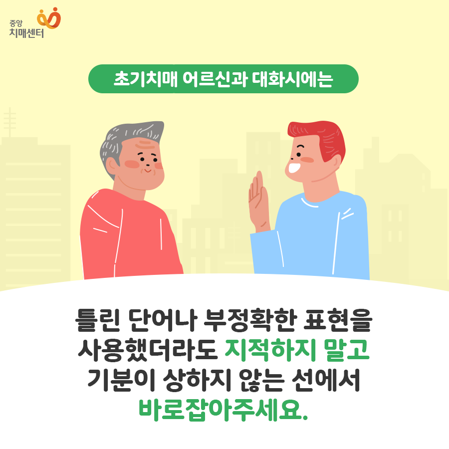 치매 환자는 인정을 하든 인정을 하지 않든 자신에게 문제가 있구나 문제가 생길 수 있다는 두려움과 불안 공포를 가지고 있기 때문에 실수나 잘못에 대해서 날카롭게 지적을 하게 되면 심리적으로 위축이 될 수 밖에 없습니다. 치매 환자의 보호자는 치매 환자가 실수나 잘못을 하더라도 최대한 마음을 다스려서 긍정적이고 따듯한 말을 해주는 것이 좋습니다.