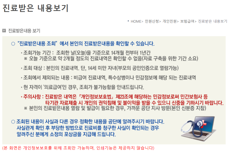 혹시 나 이외의 다른 사람들이 내 진료기록을 볼 수 있지 않을까 우려를 하는 경우도 있을텐데요. 일반적으로 개인의 진료내역은 국민건강보험공단에 로그인을 하면 진료내역에 대한 조회가 가능합니다. 그러나 정신건강의학과와 산부인과, 비뇨기과와 같은 민감한 의료 정보는 공인인증서로 로그인해도 조회가 안됩니다. 본인이 직접 국민건강보험공단을 방문해야 조회가 가능합니다.