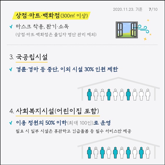 - 의무 : 마스크 착용, 출입자 명단 관리, 환기·소독 등