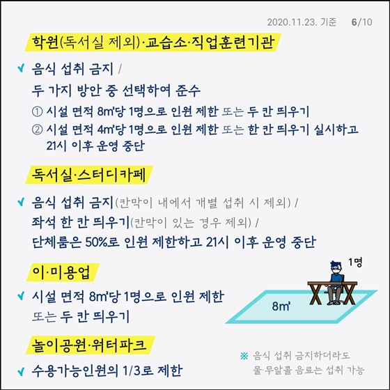 놀이공원·워터파크도 수용 가능 인원의 1/3으로 인원을 제한하고, 이·미용업은 시설 면적 8㎡당 1명으로 인원을 제한하거나 좌석 두 칸 띄우기를 실시한다.