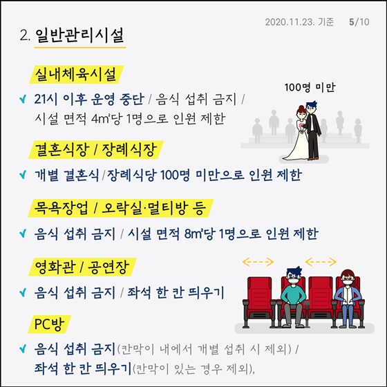 아울러 영화관, 공연장, PC방, 독서실·스터디카페 등은 좌석 한 칸 띄우기를 실시해야 하는데, 다만 독서실·스터디카페도 단체룸은 인원을 50%로 제한하고 21시 이후 운영을 중단한다.