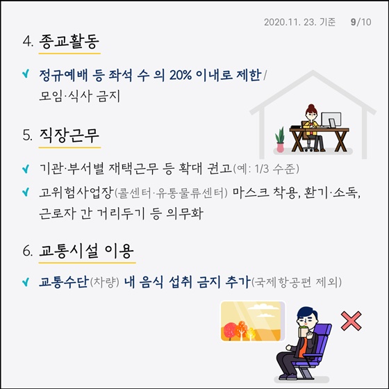 종교활동의 경우 정규예배·미사·법회·시일식 등은 좌석 수의 20% 이내로 참여가 가능하며 종교시설 주관의 모임과 식사는 금지되고, 공공기관은 재택근무와 점심시간 시차운영, 시차출퇴근제 등을 적극 활용하도록 하며 민간기관에도 이를 권고한다.