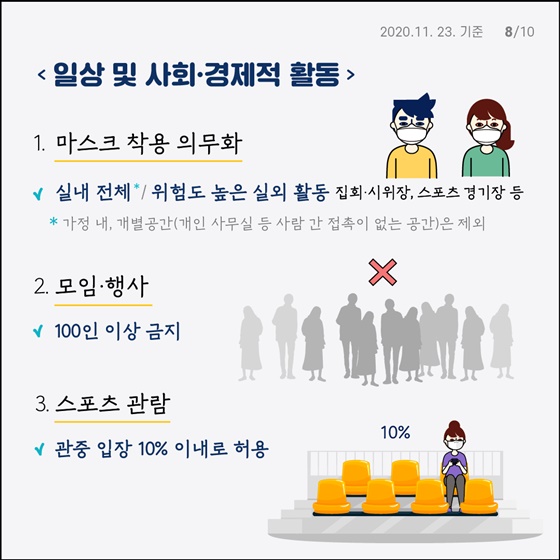 결혼식, 기념식, 동호회 등 각종 모임·행사도 100인 미만으로 인원이 제한되며, 마스크 착용 등 핵심 방역수칙이 의무화된다.