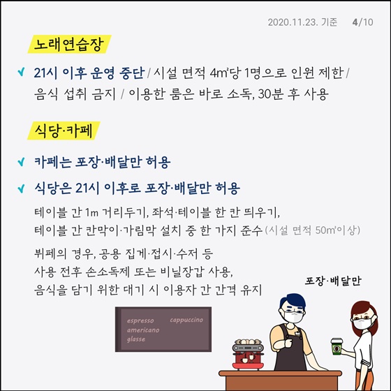 또한 노래연습장은 21시 이후 운영이 중단되고 시설 면적 4㎡당 1명으로 인원을 제한하며 음식 섭취를 금지한다. 단, 음식 섭취를 금지하더라도 물이나 무알콜 음료는 섭취가 가능하다.