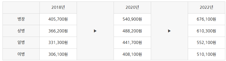 아래 표를 통해서 군인 월급이 2018년, 2020년, 2022년까지 어느 정도로 인상되는지 한눈에 파악하실 수 있습니다. 꽤 큰 폭으로 인상되고 있는 것을 알 수 있습니다.