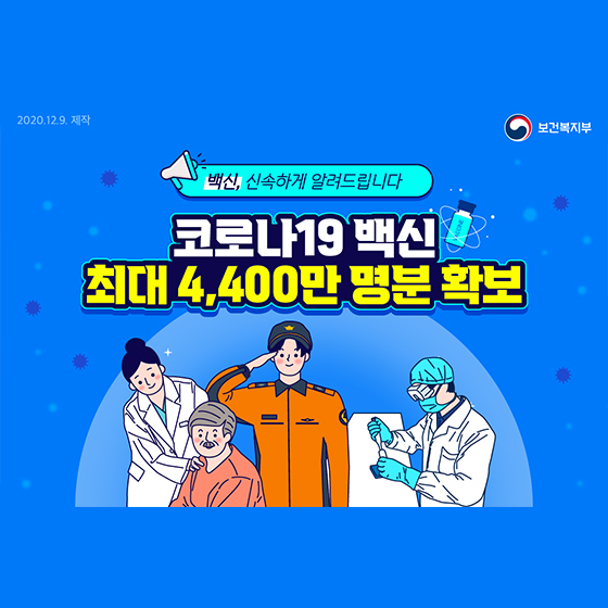 우리나라의 경우에는 최대 4400만명분의 백신이 확보되었습니다. 글로벌 백신 기업인 아스트라제네카, 화이자, 얀센, 모더나로부터 3400만 명분 선구매했고 코박스 퍼실러티를 통해서 1천만명 분이 확보되었습니다. 그래서 총 4400만명분이 확보되었습니다.