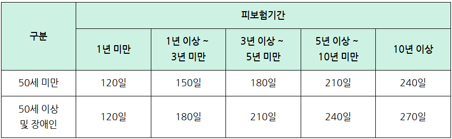 고용보험 가입 기간과 나이에 따라서 120~270일간 보험금 수령 가능합니다.
