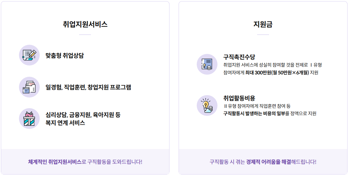 - 사후관리 : 취업시 취업성공수당 지급, 미취업 시 취업정보 제공 등