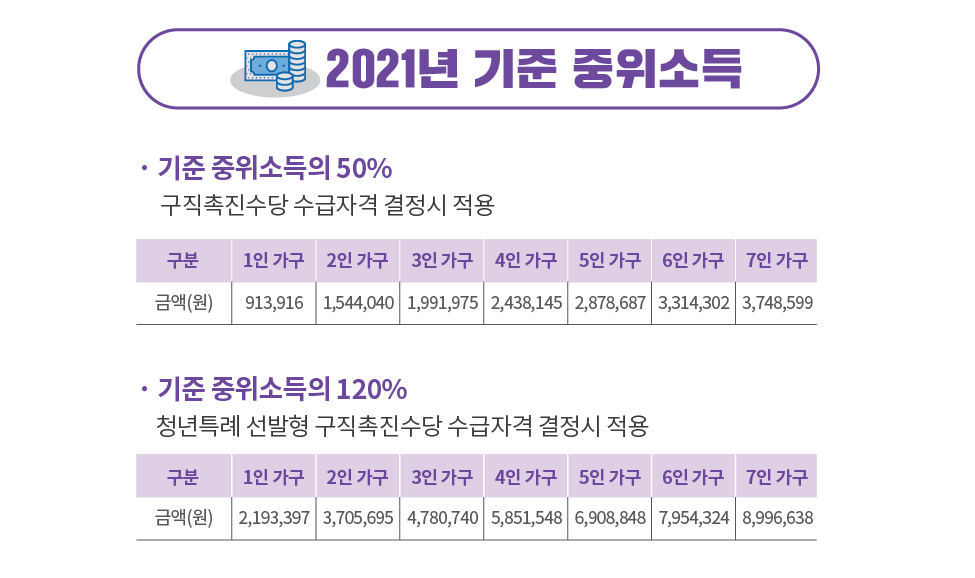 - 중장년층 : 35세~69세, 기준 중위소득 100%, 이하인자