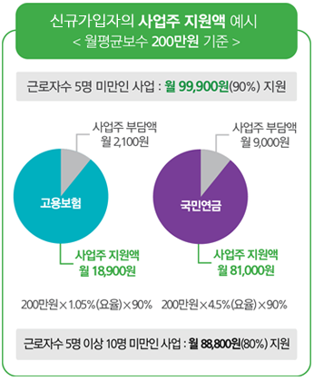 직원의 월평균 보수가 200만원이라면 고용보험의 경우 사업주는 월 2100원, 국민연금은 월 9000원만 부담하면 됩니다.