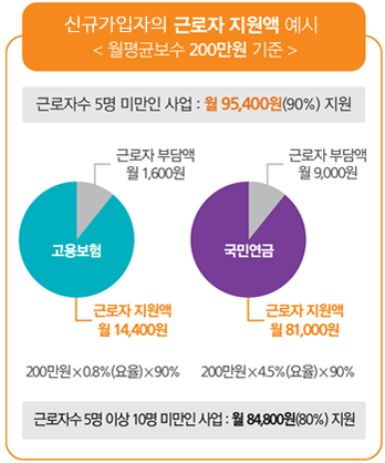 근로자수가 10명 미만인 회사에 고용된 직원 중에서 월평균보수가 215만원 미만인 근로자와 사업주에게 고용보험과 국민연금을 80% 또는 90% 지원해줍니다. 따라서 근로자와 사업주는 원래 납부해야하는 금액에서 10% 또는 20%만 납부하면 됩니다.