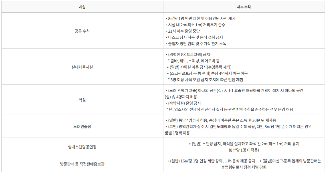 - 식당·카페에서는 전국적인 식당·카페 방역 수칙을 동일하게 준수해야 하며, 이외 탈의실·오락실 등의 부대시설은 시설 면적 8㎡당 1명으로 인원을 제한합니다.