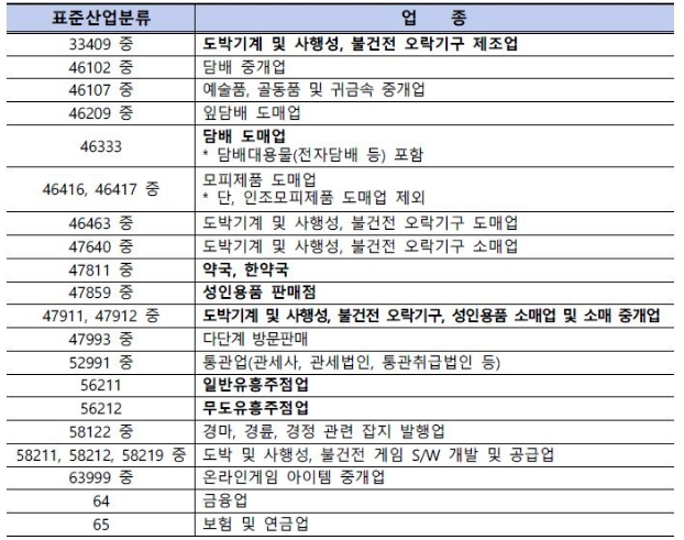 - 담배나 복권, 도박, 경마·경륜, 성인용 게임 등