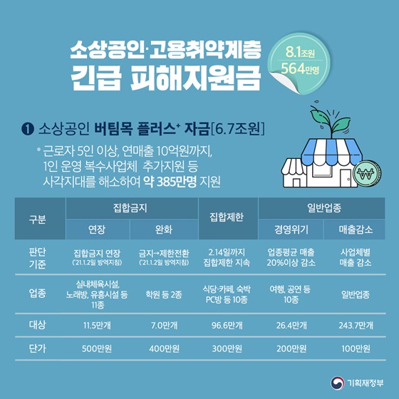 • 집합금지(연장) - 실내체육시설, 노래연습장, 유흥업소 11종 (500만원 지원)