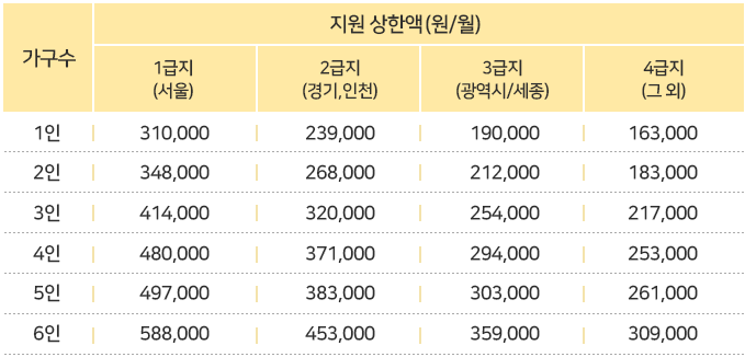 청주 거주 부모(2명) + 성남 판교 거주 청년 (1명)로 구성된 3인 가구로 지급되던 주거급여가 부모(청주2인), 청년(성남 1인)으로 분리지급됩니다. 아래표는 가구수와 지역에 따른 지원금액입니다.