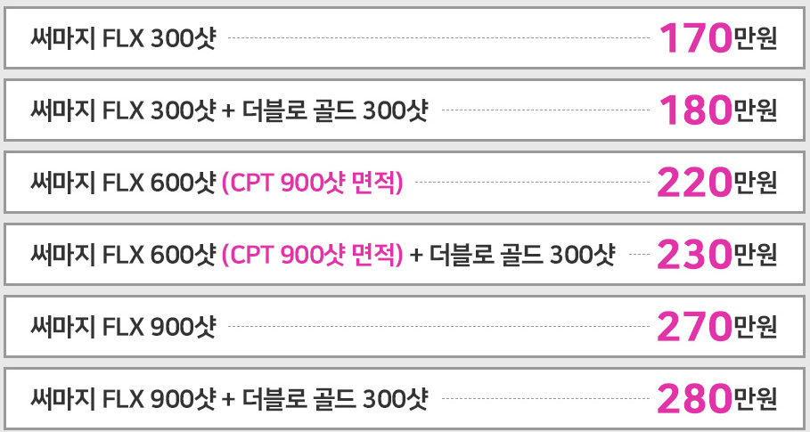 이 가격은 써마지 4세대 장비인 FLX 기준입니다. 3세대 장비인 CPT의 경우에는 가격대 좀 더 저렴합니다.