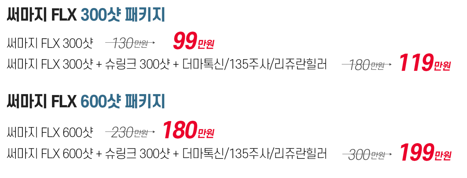 써마지 300샷 99만원, 써마지 600샷 180만원입니다.