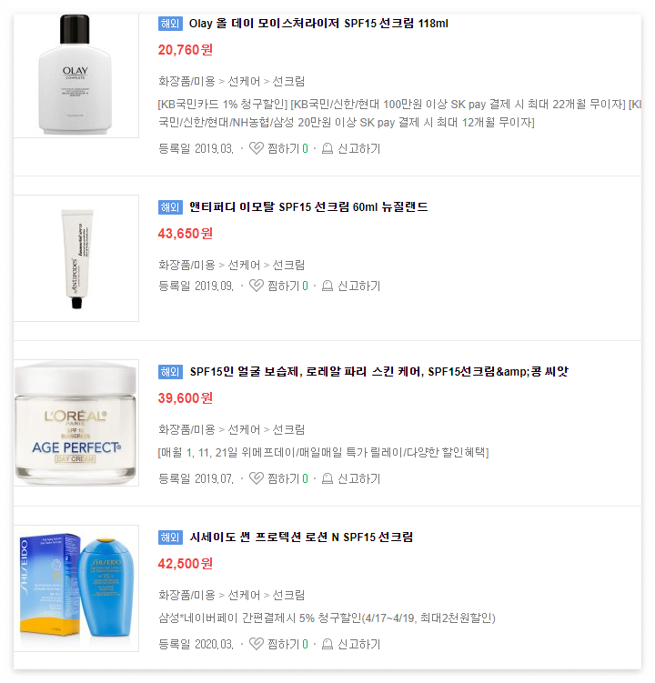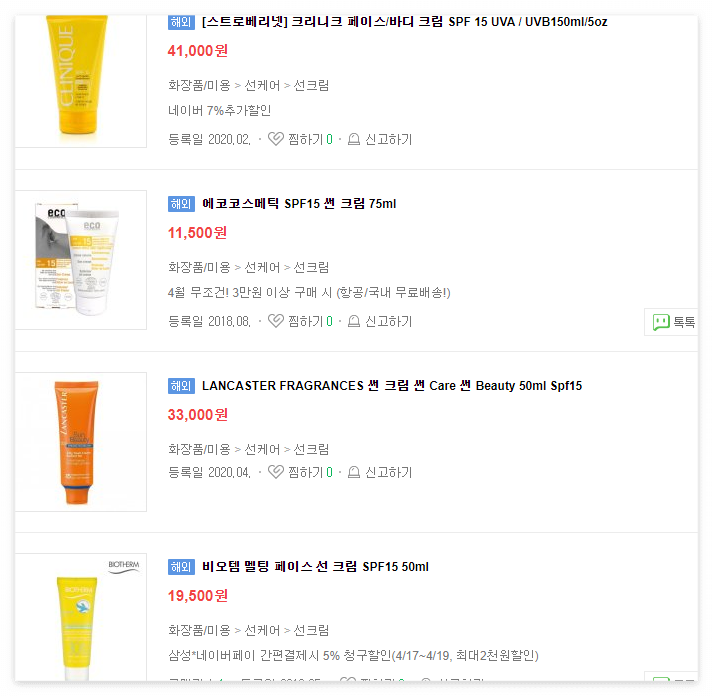 외출이라고는 출퇴근 10분인데 그 10분 때문에 SPF 40, 45, 50의 선크림을 일상 생활에서 사용하기에는 너무 부담스럽게 느껴져서 SPF 지수가 낮은 SPF15 선크림을 찾아보았습니다. 그런데 국내 쇼핑몰에서는 거의 판매하지 않습니다.