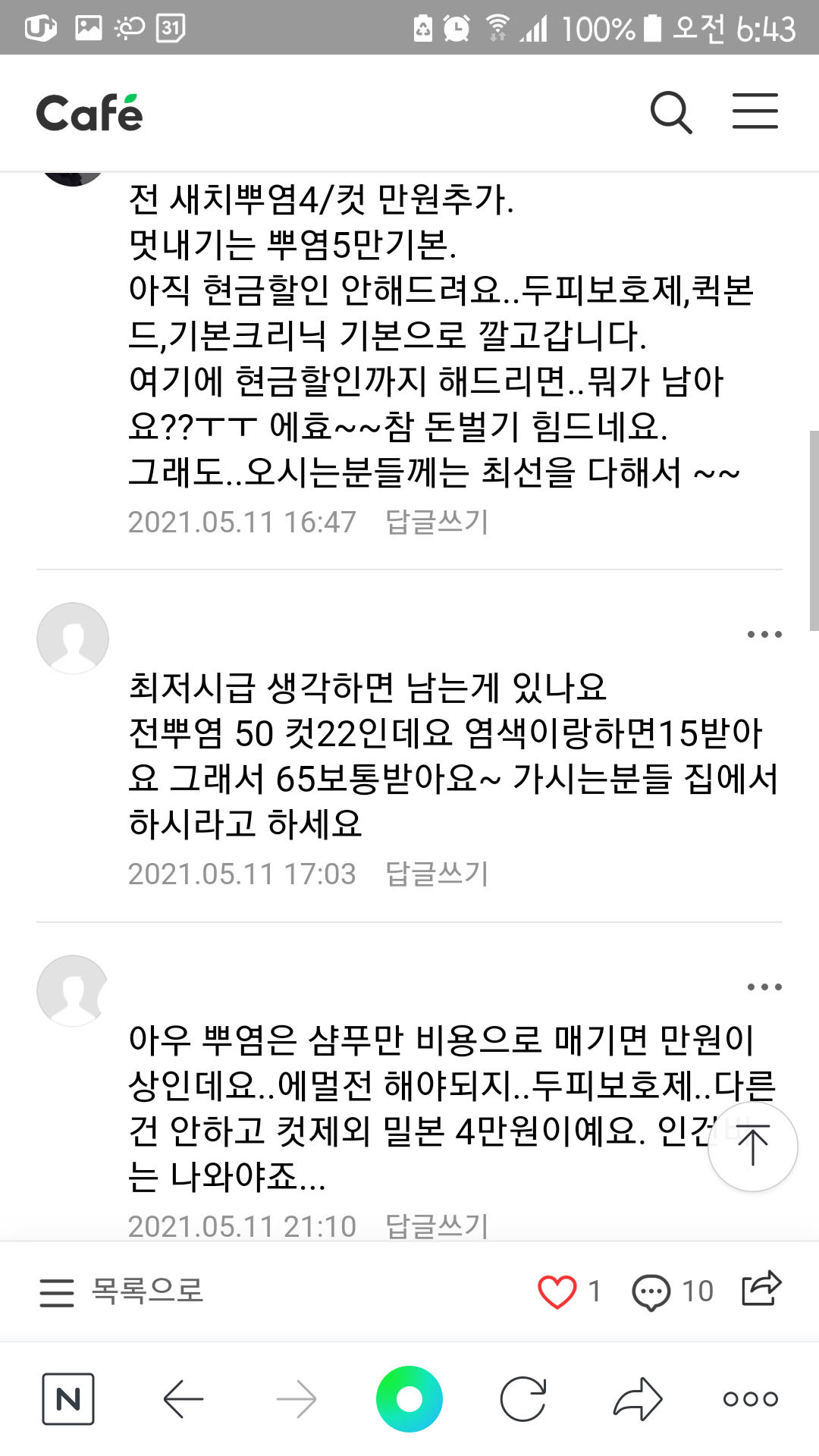 아래는 미용인분들이 뿌리염색 가격 비용과 관련해서 나누는 대화 내용입니다.