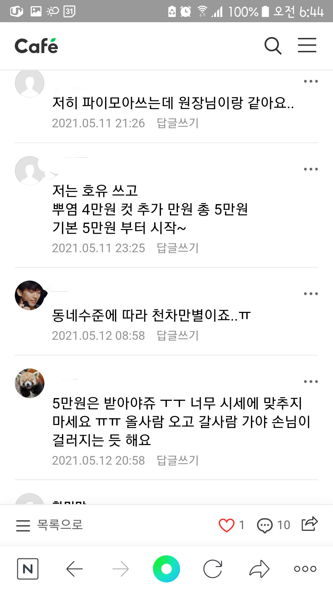 저희 동네는 기본 염색 5만원, 커트 1만원 추가인데 위의 대화 내용으로보면 평균 가격 비용으로 보입니다. 2개월에 한번씩 염색을 한다고 할 경우, 1개월 동안 2만 5천원이고 하루로 치면 약 830원을 뿌리 염색 비용에 사용한다고 생각하시면 됩니다.