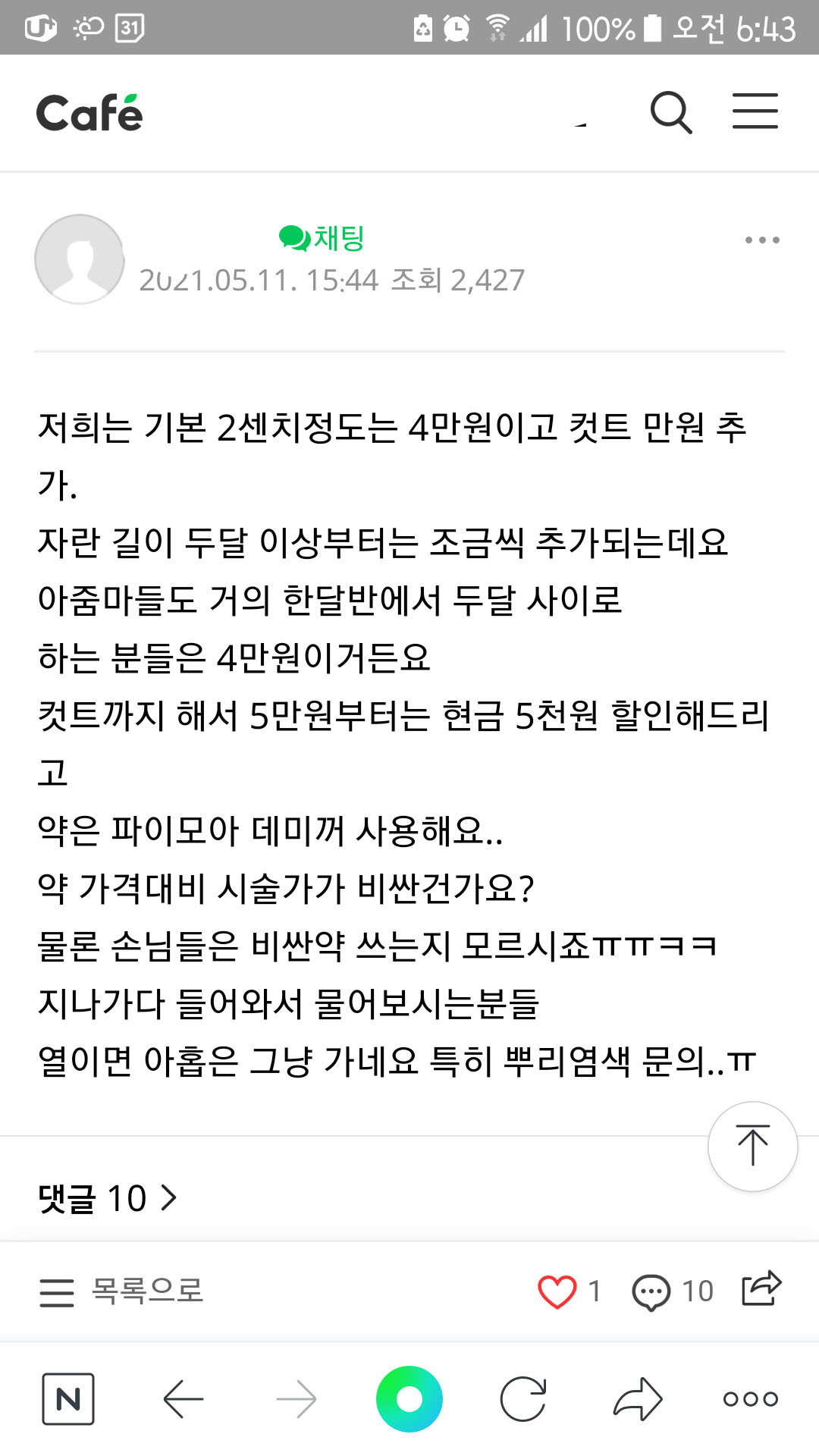뿌리염색 4만원, 커트는 만원 총 5만원
