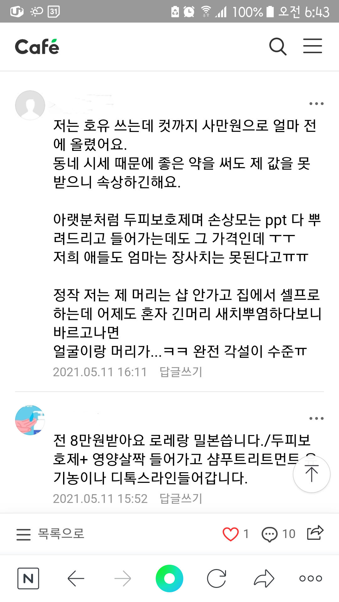 저희 동네는 기본 염색 5만원, 커트 1만원 추가인데 위의 대화 내용으로보면 평균 가격 비용으로 보입니다. 2개월에 한번씩 염색을 한다고 할 경우, 1개월 동안 2만 5천원이고 하루로 치면 약 830원을 뿌리 염색 비용에 사용한다고 생각하시면 됩니다.