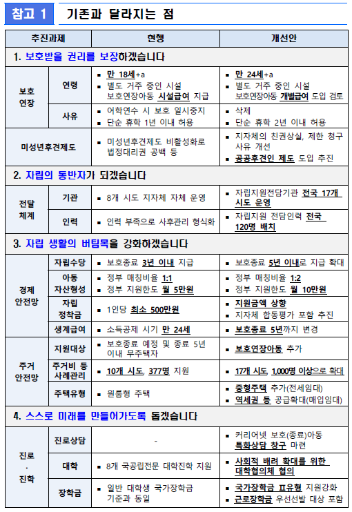 이 외에도 보호종료아동을 위한 개선된 제도 등을 추가적으로 확인해보겠습니다.
