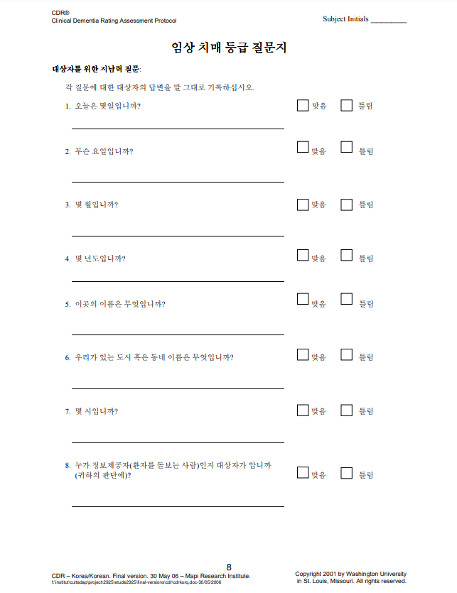 CDR 측정을 위해 환자와 보호자에게 하는 질문 몇가지를 살펴보겠습니다.