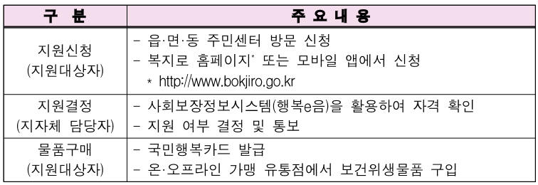 - 본인 또는 부호자 명의의 국민행복카드 발급 신청을 해서 생리대 구입