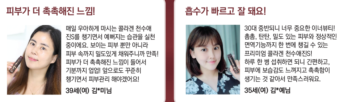 아래는 홈페이지에 나와있는 천수애진 후기입니다. 일반 사용자의 후기는 아니지만 꼭 마셔야하는 이유, 왜 천수애진 제품을 마시는지 등에 대해서 나와 있으니 참고하시기 바랍니다.