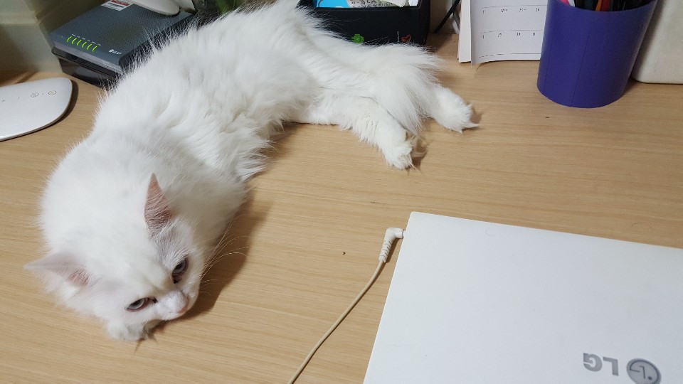 제 방 책상 밑으로 숨어 들어갔습니다. 약간 겁먹은 표정. 페르시안 고양이는 눈이 보석처럼 너무 예뻤습니다.