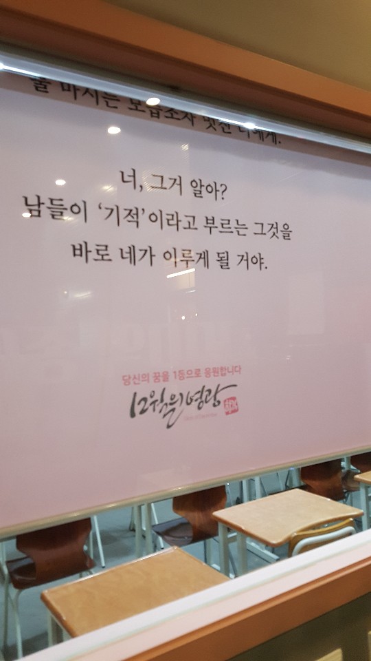 아래 한수민 원장님의 인터뷰 영상이 있습니다. 인터뷰 내용에서 정말 놀라운 것은 <12월의 영광>은 따로 신입생 모집을 하지 않는다고 합니다. 시험날이 되면 학생들의 학교로 찾아가서 아침밥을 나눠준다고 합니다. 학원에서 이렇게까지 신경을 써준다면 <12월의 영광> 학원생들은 학원에 대한 자부심이 대단할 것이고 다니지 않는 학생들은 부모님을 졸라서 학원을 다니거나 다른 학원을 다니고 있는 학생이라면 다니던 학원을 그만두고 <12월의 영광>으로 학원을 옮길 것 같습니다. 학원 강사님들 입장에서보면 학원이 잘되고 수강생도 많으면 엄청 귀찮은 일일텐데 학생들과 학원을 위해서 기꺼이 수고로움을 무릅쓰고 저런 활동을 한다는 것이 놀랍고 또 그렇게 할 수 있도록 뒷받침이 되어주는 한수민 원장님의 내공이 놀라울 따름입니다.