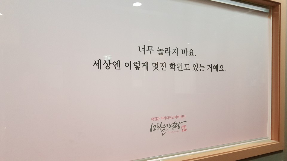 입시 학원인데 <12월의 영광>이라는 학원 이름도 남다릅니다. 학생들이 11월에 수능을 보는데 12월에 좋은 결과가 많이 나오기를 기대하는 마음에서 만든 이름이라고 합니다. 학원을 운영하는 한수민 원장님의 철학도 남다릅니다. <학원은 파라다이스>여야 한다는 철학을 가지고 있습니다. 그러한 철학을 바탕으로 2006년 처음 12명의 학생으로 시작해서 지금은 1000명에 이르는 대형 학원으로 급성장했습니다. 정말 드라마틱한 성장입니다.
