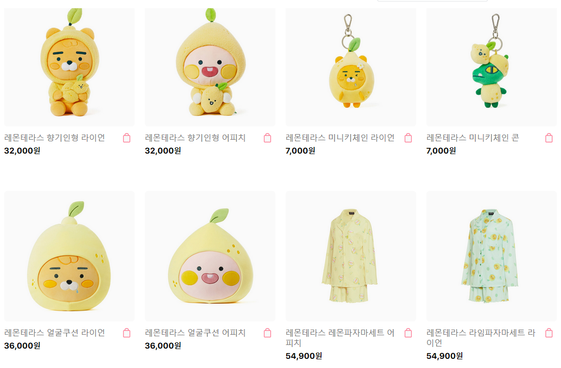 파자마, 페이스파우치, 곱창끈, 세안밴드, 롱슬리퍼 등 다양한 제품으로 라이언과 어치피를 만나볼 수 있네요. 라이언과 어피치가 대부분 캐릭터 모델로 활동하고 있는 것 같습니다.