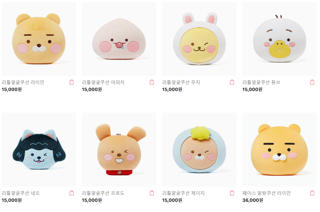 라이언과 어피치 뿐만 아니라 무지, 튜브, 네오, 프로도, 제이지까지 다양한 얼굴 쿠션이 있습니다. 저는 어피치 쿠션을 가지고 있습니다. 블때마다 귀엽고 상큼해서 기분이 좋아집니다.