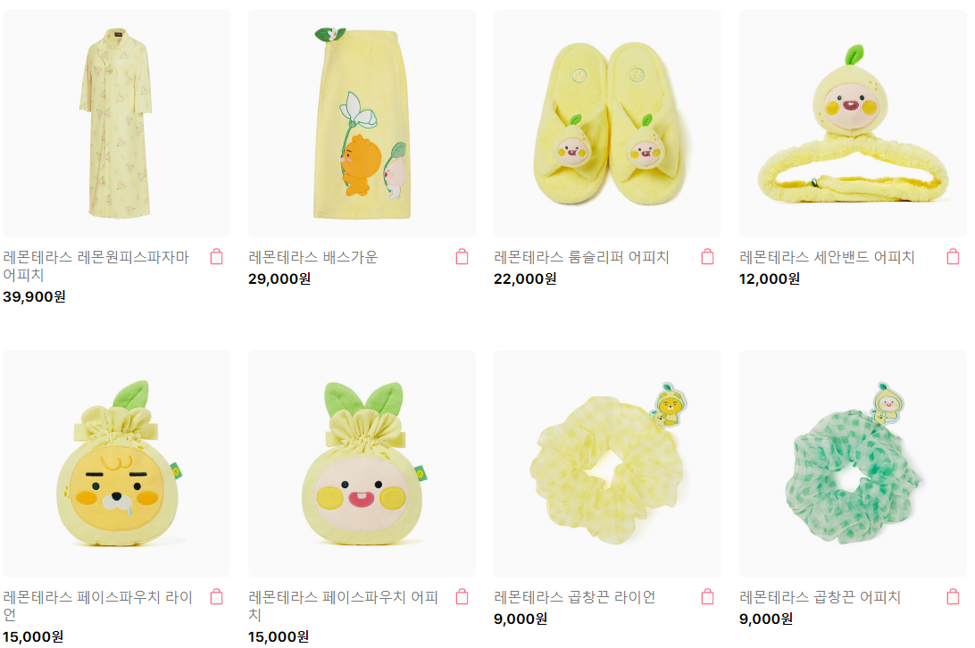 파자마, 페이스파우치, 곱창끈, 세안밴드, 롱슬리퍼 등 다양한 제품으로 라이언과 어치피를 만나볼 수 있네요. 라이언과 어피치가 대부분 캐릭터 모델로 활동하고 있는 것 같습니다.